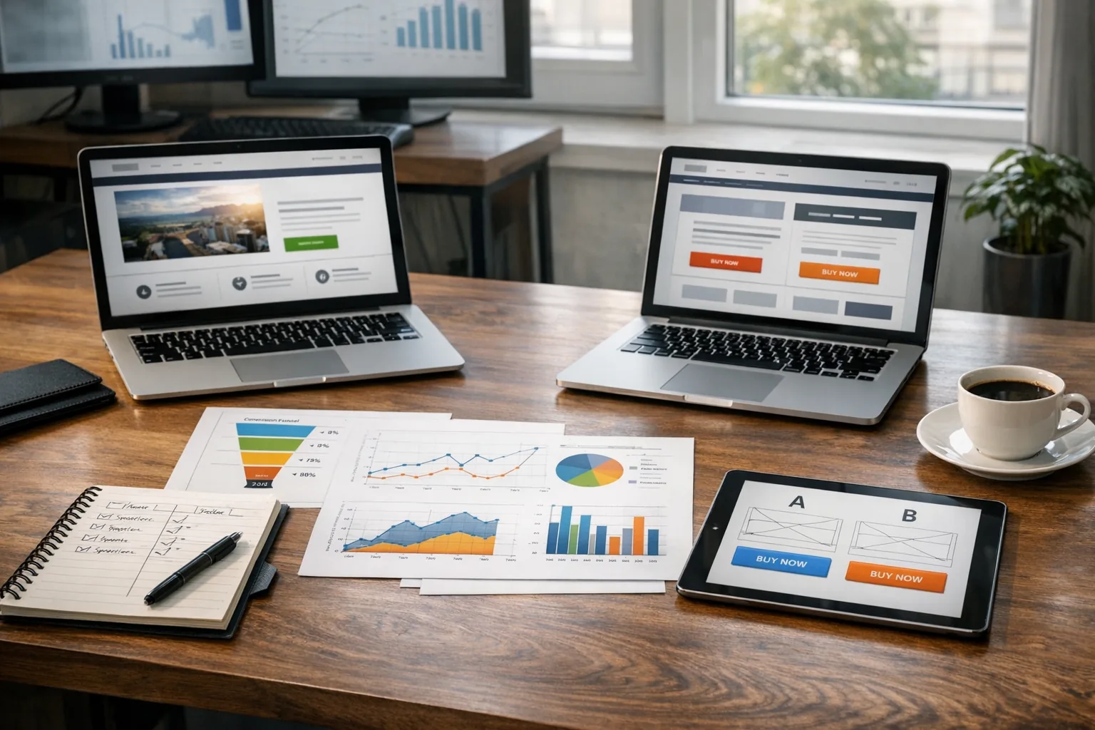 - Nie zaczynaj od drobiazgów: najpierw porównuj ofertę, nagłówek, zaufanie, cenę, dostawę, formularz lub checkout, a nie sam kolor przycisku.