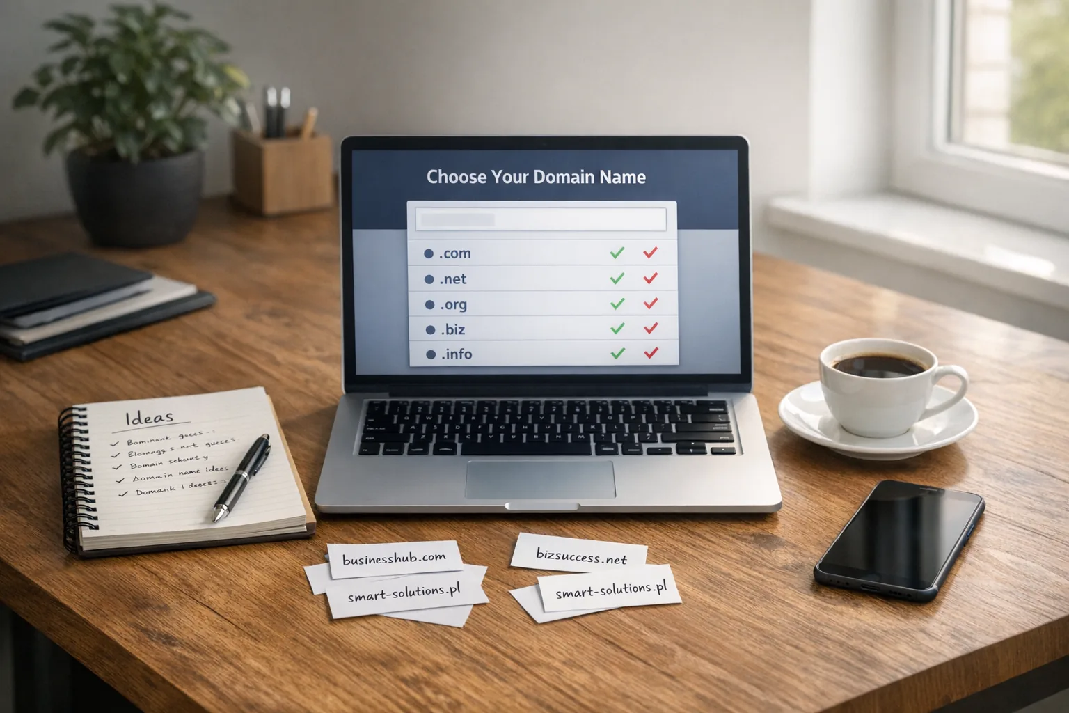 Najkrótszy filtr brzmi tak: wybierz adres, który przechodzi test telefonu, test wpisania z pamięci i test adresu e-mail. Dopiero potem decyduj, czy ma to być sama marka, marka z krótkim dopiskiem, domena .pl, .com czy oba warianty. Jeżeli dobra domena jest zajęta, lepiej zmienić konstrukcję nazwy niż ratować słaby pomysł cyfrą, myślnikiem albo przypadkową końcówką.